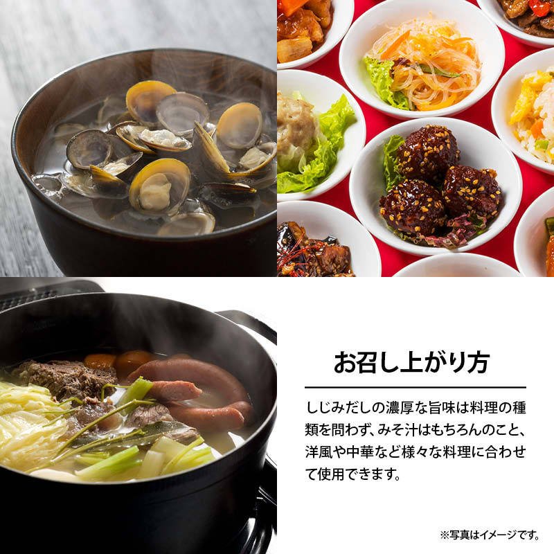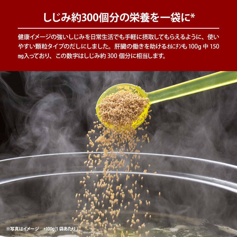 ◆商品説明:健康イメージの強いしじみを日常生活でも手軽に摂取、健康習慣!2019年に某TV番組でも有名アーティストが使用していることで、話題性も広がりました。風味豊かなしじみのだしの素。肝臓の働きを助けるオルニチンも100g中150mg入っており、この数字はしじみ約300個分に相当します。しじみだしの濃厚な旨味は料理の種類を問わず、みそ汁はもちろんのこと、洋風や中華など様々な料理に合います。